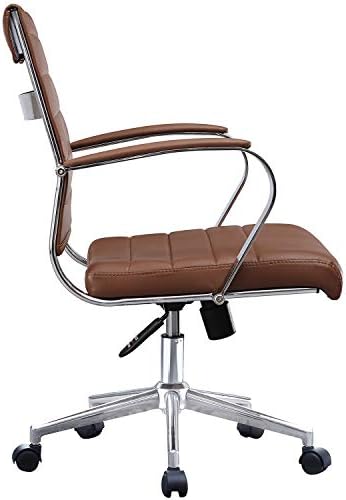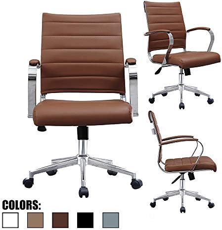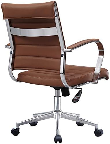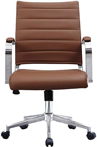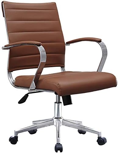 2xhome Brown Modern Mid Century Modern Contemporary Mid Back Ribbed PU Leather Swivel Tilt Adjustable Chair Executive Manager Office Conference Room Work Task Computer Ribbed Desk Chrome Wheels Arms