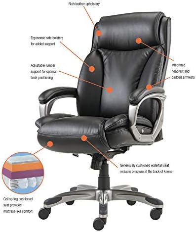 Price: (as of – Details) Coil spring cushioned seat provides long-lasting, mattress-like comfort. ergonomic side bolsters for added support. adjustable lumbar support for optimal back positioning. integrated cushioned leather headrest and padded leather armrests. five-star base with protective foot zones. Coil spring cushioned seat provides long-lastingErgonomic side bolsters for added support