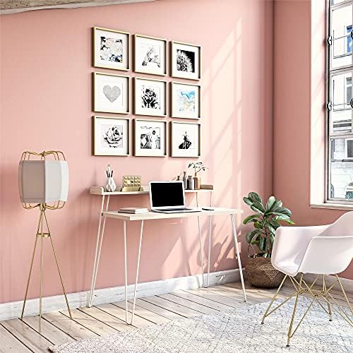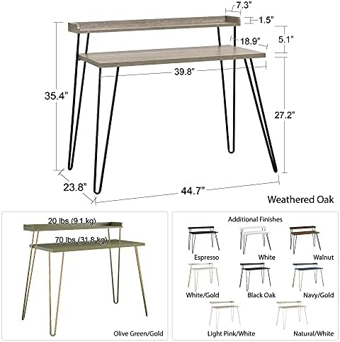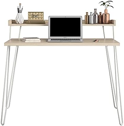 Mix industrial and modern styles together to get the Ameriwood Home Haven Retro Desk with Riser. This Desk is perfect for smaller spaces with its small footprint and offers 2 levels of desk space with the added riser. The light brown woodgrain finish coordites with almost any décor while the lamited particleboard desktop and white powder-coated metal legs give this Desk a sturdy build along with a fun design. Use the Haven Desk in a home office or create an office space that works for you anywhere in your home. The desktop is large enough to hold your laptop, notebooks, and office essentials while the riser can be used to keep items close by but out of your way. The metal hairpin legs are a fun throwback to popular mid-century design. The Haven Retro Desk with Riser ships flat to your door and requires minimal assembly upon delivery. Two adults are recommended for proper assembly. Desk can hold up to 70 lbs. while the riser can hold 20 lbs. Once assembled, Desk measures to be 36”H X 44.7”W X 23.8”D.