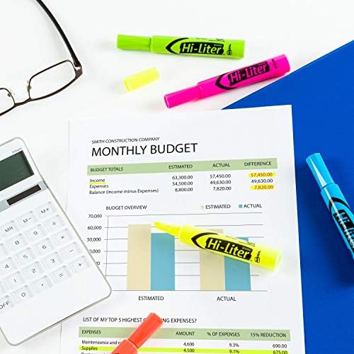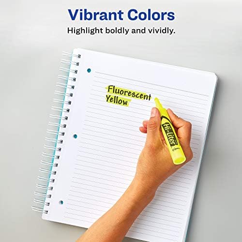 Bring attention to essential words and phrases with AVERY Hi-Liter Desk-Style Highlighters. The molded chisel tip of these assorted color highlighters gives you the precision to highlight or underline text in eye-catching fluorescent inks. Keep your documents in pristine condition with a smear-safe highlighter ink that doesn’t bleed through most paper and won’t smudge pen, marker or inkjet inks. Built to last, these highlighters have a resilient tip that won’t fray and a comfortable faceted barrel with a long-lasting ink supply. The improved ink formula ensures that highlighters can be left uncapped for up to one week without drying out. Don’t worry about getting highlighter ink onto your hands; The water-based ink is easy to wash from skin and is ACMI-certified nontoxic, making these AVERY highlighters safe for kids and classroom use. A must-have item for back to school, home and office use, this assorted pack of 12 fluorescent highlighters is perfect for highlighting textbooks, sorting out budgets, test prep, color-coding your planner, and is a great addition to any list of school supplies or bullet journal supplies. Package includes 1 Fluorescent Blue highlighter, 1 Fluorescent Green highlighter, 1 Fluorescent Orange highlighter, 3 Fluorescent Pink highlighters and 6 Fluorescent Yellow highlighters.