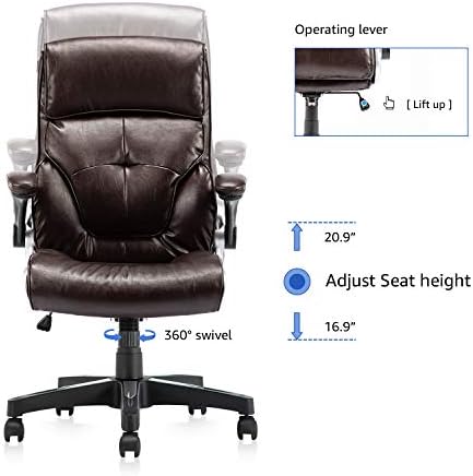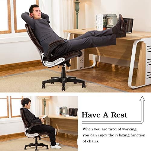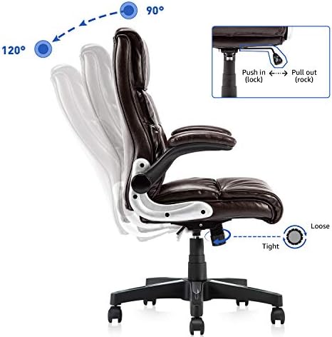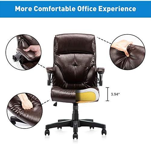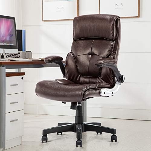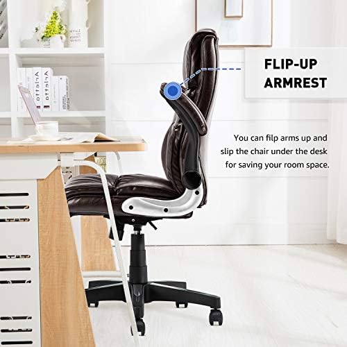 The computer desk chair offers luxurious comfort and support thanks to the thick cushion with extra thick segmented padding throughout the back and seat. The smooth Soft head PU leather further adds to the upscale look and feel.This leather office chair is engineered for performance, with features that thoughtfully designed headrest of computer chair fits human arc and thus relieves neck fatigue; bilateral arc backrest, based on the curvature of the waist, relieves stress on the spine and protects the lumbar area; Flip-up arms that make it easy to practice like play guitar.The desk chair also can be pushed under the table to free up space.In addition to 360-degree swivel and seat and back tilt, the ergonomic computer chair features an adjustable lumbar support system for additional support. The comfort and stylish look point of this high back executive office chair make it a perfect ergonomic upgrade to your office, whether at work or at home.This high back office chair meets or exceeds industry standards for safety and durability, and is backed by one of the strongest warranties in the industry.