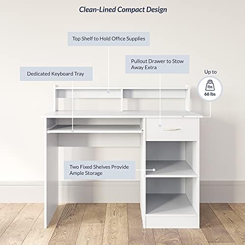 BELLEZE Modern 42 Inch Small Home Office Computer Laptop Desk or Writing Study Workstation in Wood with Single Drawer, Two Open Cubby Storages, and Hutch – Wren (White)