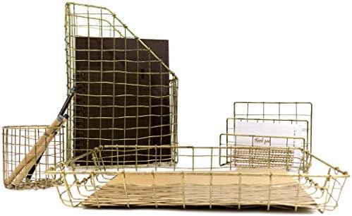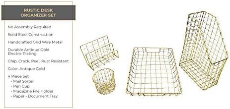 Blu Monaco Office Supplies Antiqued Brass Gold Desk Accessories-4 Piece Wire Desk Organizer Set-Mail Sorter-Letter Tray-Pen Cup-Magazine Holder-Rustic Vintage Gold Brass Wire Office Organizer