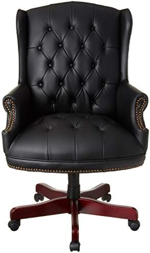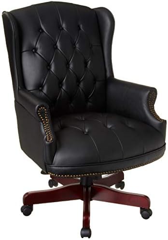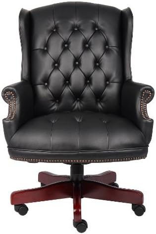 Price: (as of – Details) Stunning with its mahogany wood finishes, the Boss Wingback Traditional Chair In Black is classic in its design, featuring button tufted styling that gives off an elegant ambiance. The hand-applied brass nail head trim further adds decoration and appeal that will make your office an attractive and welcome place. The