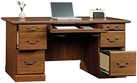 Two file drawers with full extension slides hold letter, legal or European size hanging files Three small drawers feature metal runners with safety stops Desk top has grommet holes for electrical cord access Finish: Milled Cherry Overall Product Dimensions: 30.3″ H x 64.3″ W x 29.5″ D
