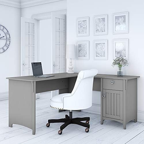 Make your home office space comfortable, functional and beautiful with the Bush Furniture Salinas L Shaped Desk with Storage. Attractive wood details, vertical accents, curved base rails and tapered legs inspired by Mission styling create a casual look fit for any cottage, family home or apartment. You’ll love all the room you have to multitask on the L Desk, designed to save space in your home with a variety of placement options, including in the corner. Have a cup of coffee as you surf the net, pay bills, read a good book or the daily news, and enjoy all the legroom you need with the open design. The desktop supports up to 200 pounds, so you can get to work with all your materials close by. Store writing utensils and small office supplies in the convenient box drawer and keep larger items in a vertical storage cabinet that features an adjustable shelf. Tumbled Pewter drop pull hardware complements your choice of seven appealing finishes to add a country feel to your space. This corner desk with storage is tested to meet ANSI/SOHO quality standards for safety and performance and is backed by the Bush Furniture 1 Year Manufacturer’s Warranty. Complete your space with coordinating items from the Salinas Collection, including an Office Chair, Storage and File Cabinets, Hutch, Desktop Organizers and more.
