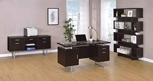 Price: (as of – Details) Enjoy an intriguing architectural design in this office desk. A floating top creates a visually enticing effect and a completely different look. Finished in deep cappuccino, it flatters surrounding décor and delivers a dramatic touch. Store essentials in a cabinet and drawer, and use a file cabinet to organize papers.