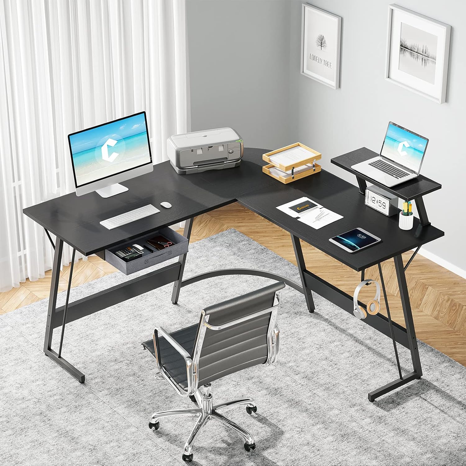 CubiCubi L Shaped Gaming Desk, 51.2" Home Office Gaming Desk, Corner Desk with Large Monitor Stand, Non-Woven Drawer, Black