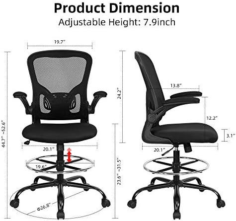 【Tall Drafting Office Chair With Flip Up Arm】Follows the feature of human spine and fits body curves well, maintain your posture and prevent back pain. Ample foam padded contoured seat with waterfall rounded edge contributes to good blood flow. Extra Large Chromed Foot Ring also offers adjustable motion, provide a resting spot for your feet.