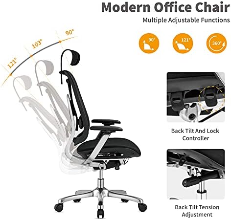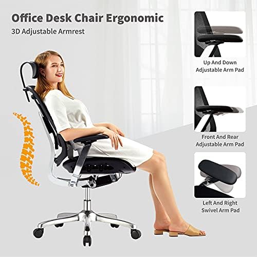 Ergonomic Office Chair with Headrest, High Back Mesh Computer Desk Chair with Adjustable Lumbar Support and Slide Seat, Tilt Limiter, 3D Armrests, Aluminum Frame Task Executive Chair for Home Office