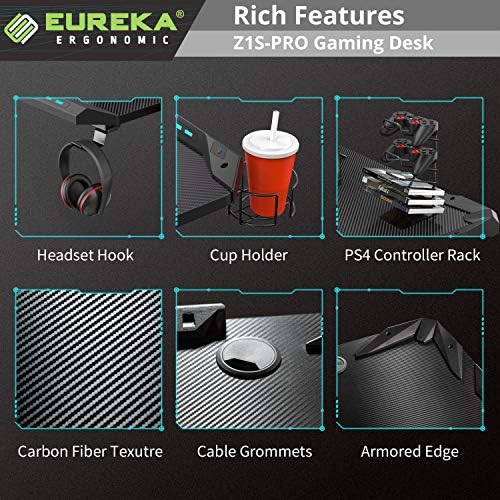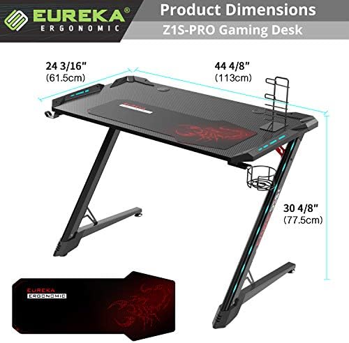 EUREKA ERGONOMIC Z1S-PRO Gaming Desk 44.5″ Z Shaped Gaming Desk Office PC Computer Gamer Desks Pro RGB LED Lights with Drink Holder Headphone Hook and Mouse Pad for Men Boyfriend Female Gift