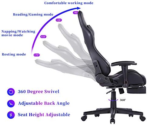 ★[MULTI FUNCTION ADJUSTABLE OFFICE CHAIR]:Armrest and seat-height adjustable; 90~170°reclining and rocking; 360°swivel; Smooth-rolling casters; Removable headrest pillow and lumbar cushion.With a pull-out flip over footrest and rocked back, you can nap on the chair like on the bed,which is perfect for relaxation during your busy working days and intense gaming time.