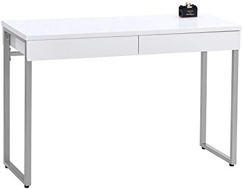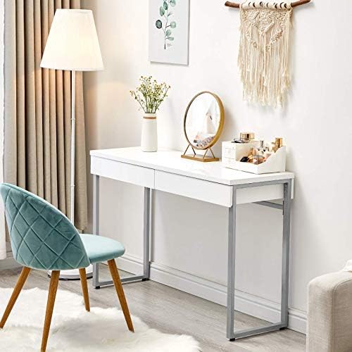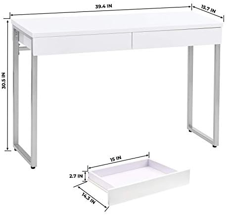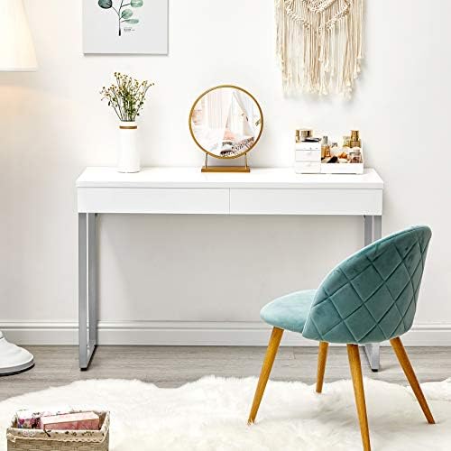 GreenForest Vanity Desk with 2 Drawers Glossy White 39.4 inch Modern Makeup Dressing Computer Writing Console Table with Metal Silver Legs