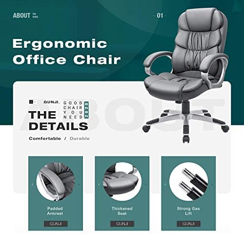 GUNJI Office Chair PU Leather High Back Executive Chair Ergonomic Computer Chair, Modern Adjustable Home Desk Chair Swivel Managerial Chair with Padded Armrests and Lumbar Support (Gray)