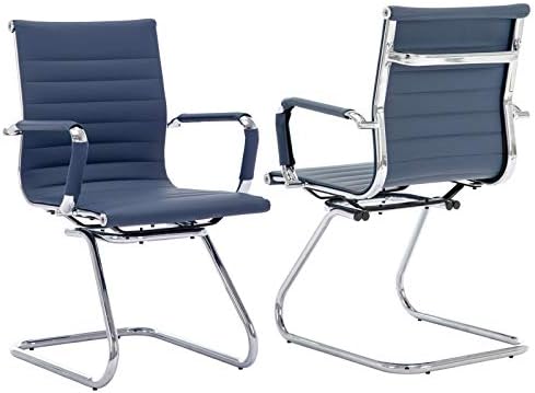 Guyou Office Reception Guest Chair Mid Back PU Leather Metal Leg Sled Base Conference Reception Room Chairs with Arms (Navy Blue, 2 PCS)