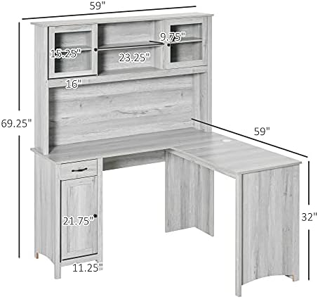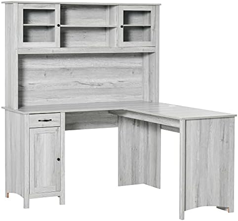 HOMCOM L-Shaped Desk with Hutch, Computer Desk with Drawers, Home Office Corner Desk Study Workstation Table with Storage Cabinets Shelves, Grey
