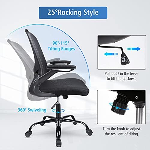 Ergonomic Design Back:Mid back Ergonomic design backrest give your lumbar support,relieve the pressure of the lumbar spine and ensure your correct sitting posture.The Armrest: 90 Flip up armrest which can be adjusted, provide comfort when you feel like to rest your arms,reduce your arm pressure.Tilt Function: Loose the tilt knob,enter into rocking style,give yourself a break from work.The rocking mode can relax you from heavy work.Chair Height Adjustable: it’s 3.2″inches height adjustable,relaxation helps you maintain a proper position by raising and lowering Pneumatic cylinder mechanism.Our gas lift cylinder has Passed SGS & BIFMA X5.1-2 which is more durable,strong bearing capacity.