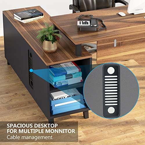 LITTLE TREE Large Executive Home Office Desk,L-Shaped Computer Des with Cabient, Business Furniture Set with File Cabinet Combo, Dark Walnut + Stainless Steel Legs