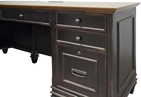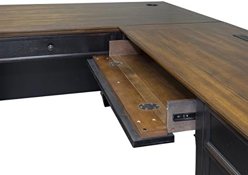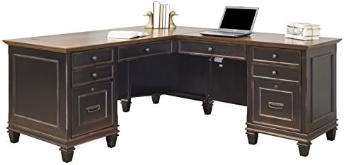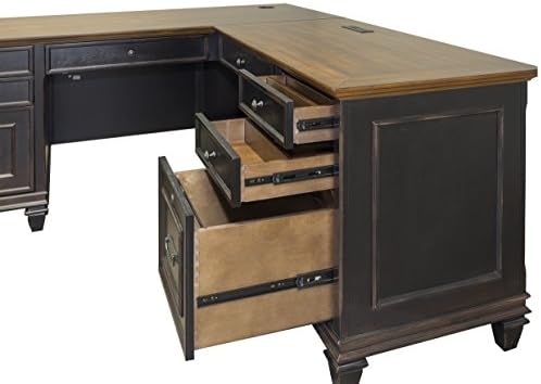 The Hartford collection combines bold lines with a weathered, vintage finish and classic style elements. The warm, two toned rubbed finish gives Hartford the relaxed feel of old world wood, while wire mesh details add a formal element. The Hartford collection will be right at home in either a classic formal setting or a relaxed, eclectic home. The L-Shaped Desk includes a drop front keyboard/pencil drawer, two utility drawers with dividers, one locking letter legal file drawer, and two wire management grommets. The return includes a drop front keyboard/pencil drawer, two utility drawers with dividers, one locking letter/legal file drawer, and a power center with two AC power outlets and three USB 2.0 connections. It is Finished on all sides for placement anywhere in a room. The desk and return arrive fully assembled. Just attach the desk to the return. Backed with a 5 year warranty.