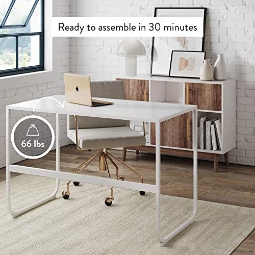 Penny is a simple, white, metal desk with a minimalist design featuring a glossy white, table-top finish and elegant rounded metal legs with six adjustable floor foot protectors. This desk table has the perfect area to display decor or can also be used as a workstation for your favorite hobbies. Penny is a well-crafted writing table or computer desk that is sturdy for daily use, such as a study, laptop, or writing desk. Nathan James is the furniture company built for this generation. You don’t need to spend a fortune to get quality design-first furniture and when we say easy assembly, we mean it. Our is our word. Your purchase is backed by a 100% money-back . If you have any quality issues just contact us and we will send you a replacement immediately—no questions asked. Materials: -High Gloss White MDF-High Gloss White Powder Coat Metal, MDF, UV PaintAssembly Must-Haves: -Scissors-Phillips-head screwdriver Weight Limit: -66 lbs