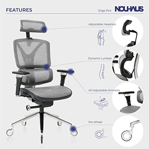 Nouhaus ErgoPRO Ergonomic Office Chair with Back Support, Computer Chair and Dorm Chair for Study. Rolling Chair with Nouhaus PROWheels, 360 Degree Swivel Chair, Mesh Office Chair. (Silver)