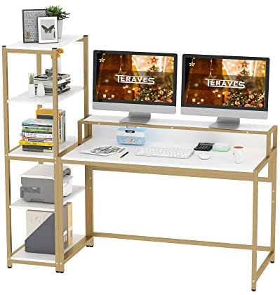 • Teraves Computer Desk with 5 Tier Shelves,Reversible Writing Desk with Storage 47 Inch Study Table for Home Office Independent Bookcase and Desk for Multiple Scenes (Desk+Shelves, White+Gold Frame)