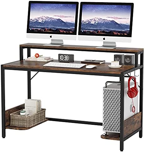 • Tribesigns Computer Desk, Industrial Office Desk with Monitor Stand, 47 Inch Studying Writing Table with Storage Shelves, Home Office Desk with 2 Hanging Hook for Small Space, Rustic Brown