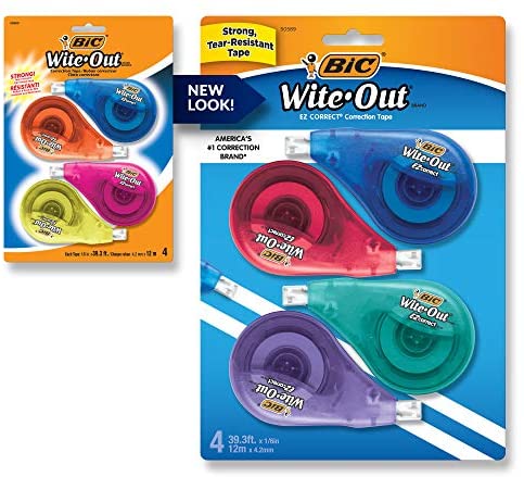 • BIC Wite-Out Brand EZ Correct Correction Tape, White, Fast, Clean & Easy To Use, Tear-Resistant Tape, 4-Count, Dispenser colors may vary