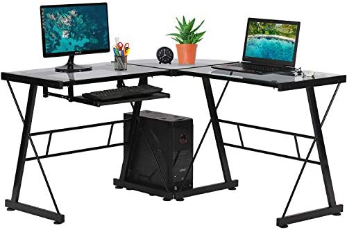 • Computer Desk Gaming Desk Toughened Glass Home Office Study Desk L Shaped Corner Writing Desk Girl Kids Student PC Modern Executive Table for Small Spaces with Keyboard CPU Stand (Clear)