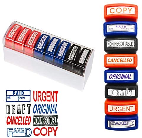 • Reliancer Set of 8 Self Inking Pre-Inked Office Stamp 8 Message Account Stamp Office Stationary Stamper Business Paper Work Text Stamps w/Tray RedBlueBlack Ink