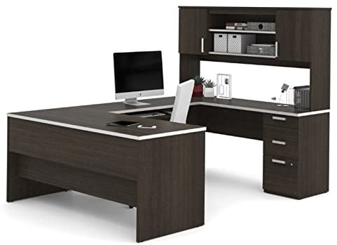 • Pemberly Row U Shaped Modern Executive Computer Desk with Pedestal and Hutch in Brown Chocolate