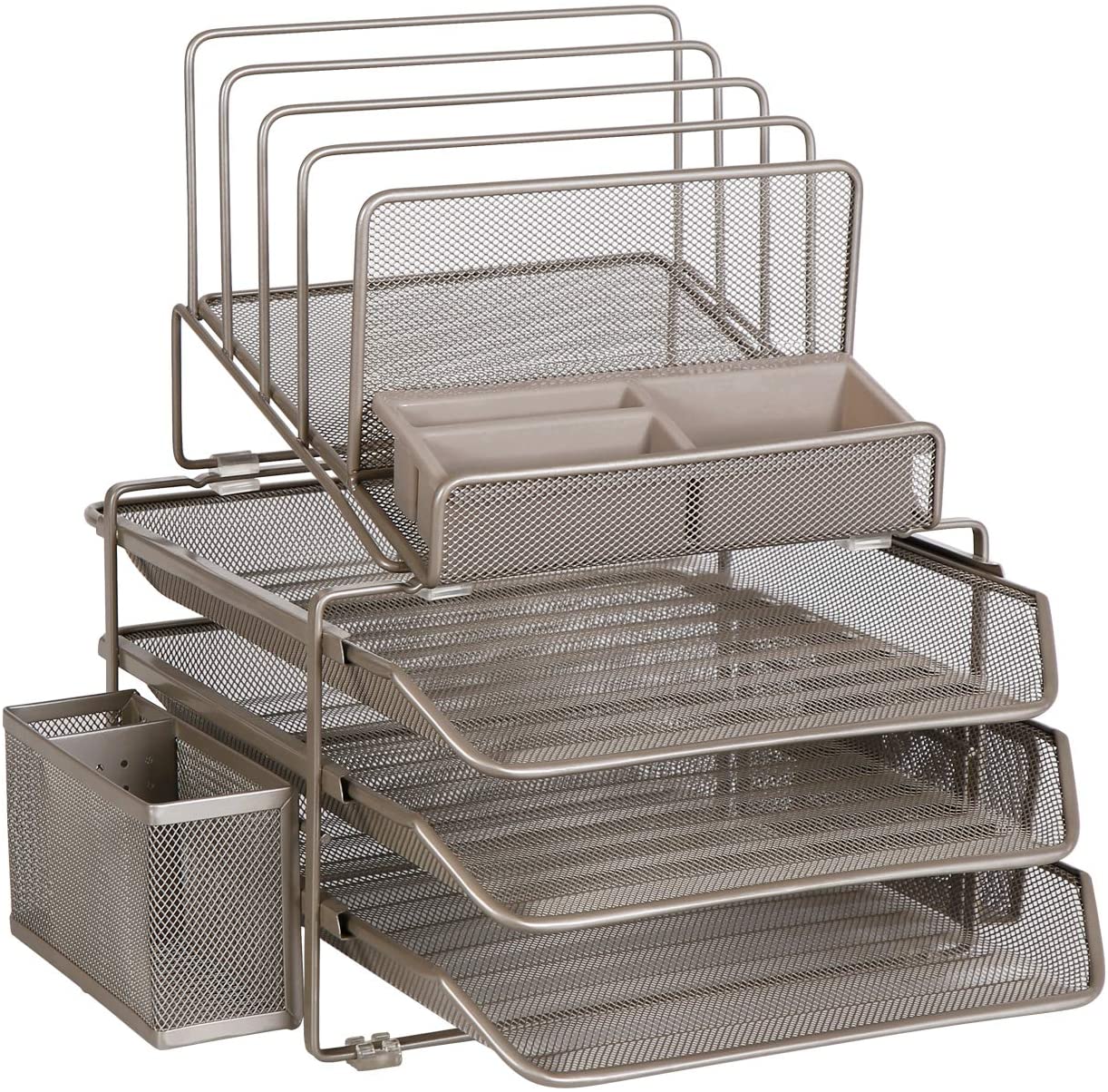 • DESIGNA Stackable Mesh Desk Organizer with 3 Sliding Letter Trays 4 File Holders 2 Side Compartments & Pencil Holder Non-slip All In One Desk Accessories Organizers Office Storage, Champagne