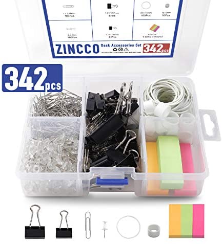 • 342 Pcs Small Office Supplies Kit with Storage Container, Metal Binder Clips Medium/Small, Paper Clips, Assorted Rubber Bands, Page Markers, Push Pins, for Home, Office, School, etc.