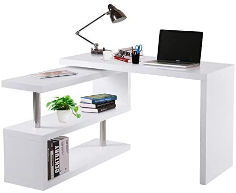 • HOMCOM 360° Rotating Corner Computer Desk Modern L-Shaped Home Office Workstation with 2 Storage Shelves, Bookshelf, White