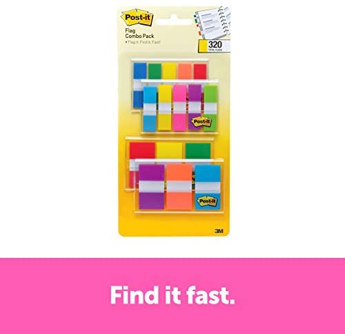 • Post-it Flags Assorted Color Combo Pack, 320 Flags Total, 200 1-Inch Wide Flags and 120 .5-Inch Wide Flags, 4 On-The-Go Dispensers/Pack (683XL1)