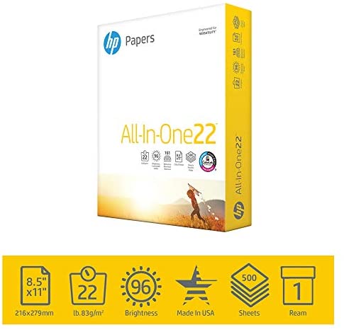 • HP Printer Paper All-In-One 22lb, 8.5 x 11, 1 Ream, 500 Sheets, Made in USA From Forest Stewardship Council (FSC) Certified Resources, 96 Bright, Acid Free, Engineered For HP Compatibility, 207010R