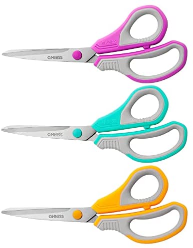 • Scissors, QMVESS 8″ Multipurpose Scissors for Office 3-Pack, Ultra Sharp School Scissors, Sturdy Durable Blade, Comfort Grip Handle for School Home Sewing Fabric Craft Supplies, Right / Left Handed