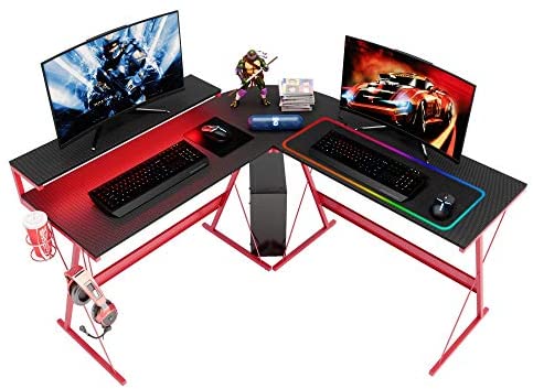 • Bestier L-Shaped Led Gaming Computer Desk, RGB Strip Light Modern Corner PC Laptop Desk Study Table Workstation Home Office Desk with Large Elevated Shelf Red