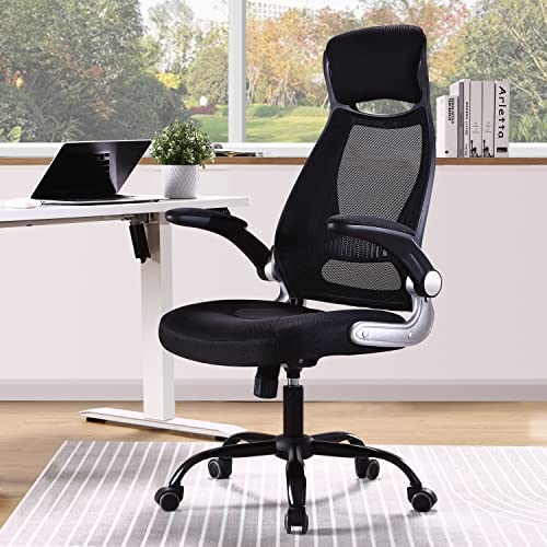 • OWLN PHILI Executive Desk Chair Mesh Ergonomic Office High Back Chair with Flip Up Armrest, Adjustable Tall Task Chair with Lumbar Support (Black – Silver)
