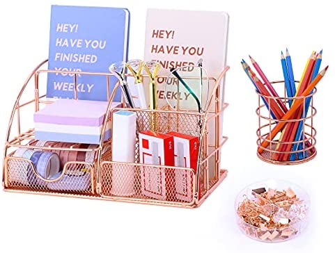 • Rose Gold Desk Organizer Mesh Office Supplies and Accessories with 6 Compartments + Drawer, Multi-Functional Desk Accessories Cute Office Supplies Storage for Women Office Home School