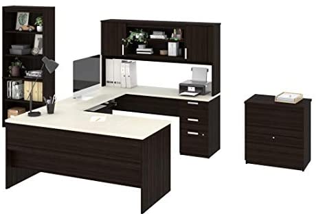 • Bestar Ridgeley Executive Computer Desk with Hutch, a lateral File Cabinet, and a Bookcase, White Chocolate