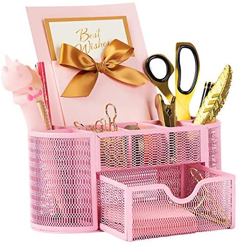 • Pink Desk Organizer for Woman,Metal Mesh Glorider Desktop Organization with 8 Compartments+Drawer,Storage for Pens,Pencil and Office Supplies,Pink Decorative Storage for Home Office School Supply