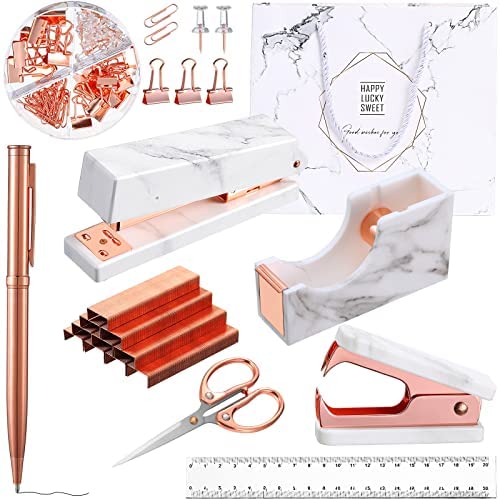 • Desk Accessory Kit Office Supplies Set Marble Rose Gold Stapler Tape Dispenser Staple Remover Staples Ballpoint Pen Paper Clips Scissor Bag Transparent Ruler Desk Organizer for Office Clerks Students