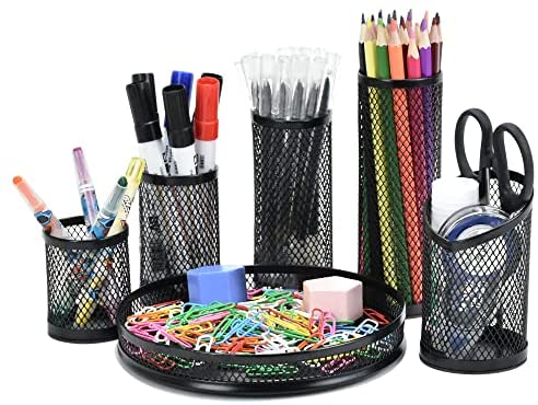 • SONKERG Pen Holder for Desk Cute, 360° Rotating 5 Grid Pen Holder, Home Office Pencil Cup, Multi-Functional Mesh Desk Organizer, Black