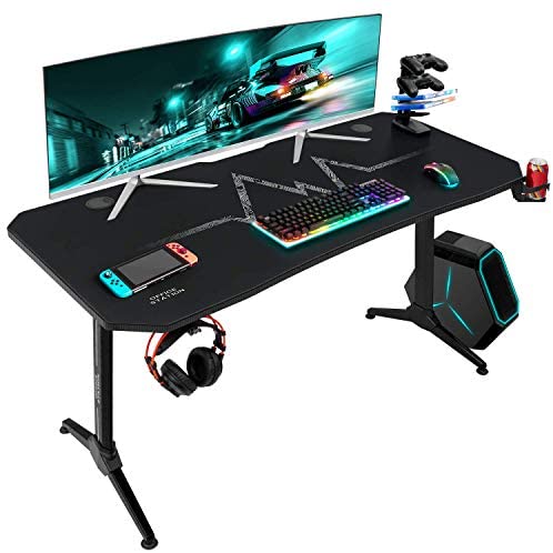 • Furmax 55 Inch Gaming Desk T-Shaped PC Computer Table with Carbon Fibre Surface Free Mouse Pad Home Office Desk Gamer Table Pro with Game Handle Rack Headphone Hook and Cup Holder (Black)