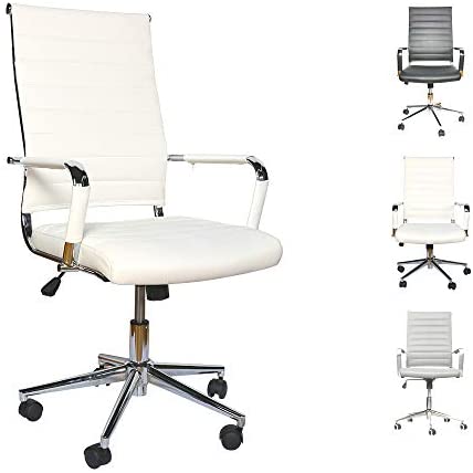 • Office Chair Desk Computer Ribbed Modern – Adjustable Height Ergonomic Leather Tilt Arm Sleeves Lumbar Support High Back Executive Meeting Conference Chrome Wheel Caster 350lbs Big(White)