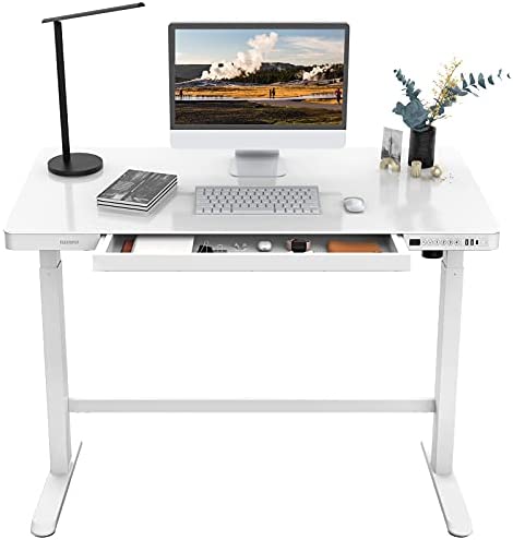 • Flexispot EG8 Glass Standing Desk with Drawers Comhar 48 x 24 Inch Electric Height Adjustable Desk White Home Office Computer Table with USB Charged, Storage Organizer
