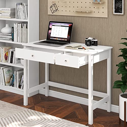 • Treocho Writing Computer Desk with Drawers for Home Office, Makeup Vanity Table Small Study Table with Storage Bedroom Simple Design, White