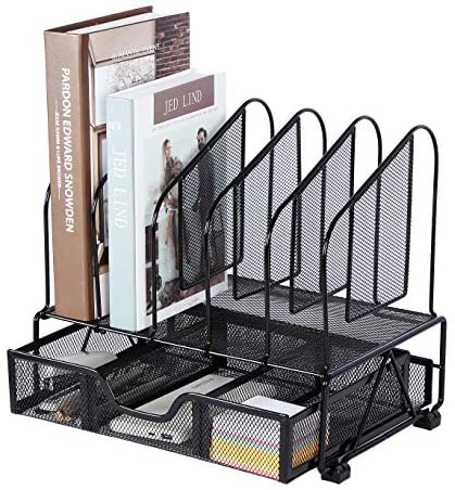 • Beiz Office Desk Organizers and Accessories with Drawer, 5 Upright Slots File Folder Storage Desktop Organizer, Mesh Desk Supplies Organization Rack for Office Home Workspace College Dorm School Black