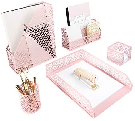 • Blu Monaco Office Supplies Pink Desk Accessories for Women-5 Piece Desk Organizer Set-Mail Sorter, Sticky Note Holder, Pen Cup, Magazine Holder, Letter Tray-Pink Room Decor for Women and Teen Girls